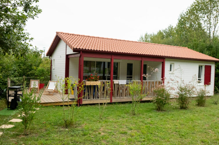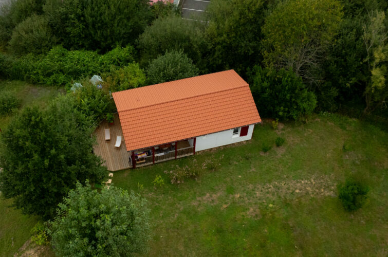 La cuisine ouvre, grâce à sa baie vitrée de 4m, sur une terrasse pour profiter de la vue sur la campagne Basque.